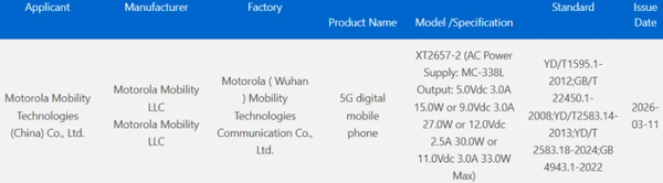 最新通过的3C认证信息显示,摩托罗拉razr 70可能将标配最高33W的有线快充。这意味着,相较于去年的上一代产品razr 60,新款机型在充电速度上或将不会有显著提升。