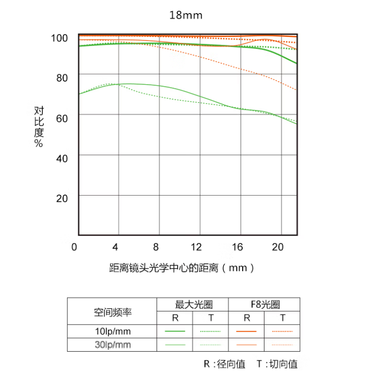 其MTF曲线表现不错,至少中心点在0.8以上了,当然F2光圈也比F1.8小一些。