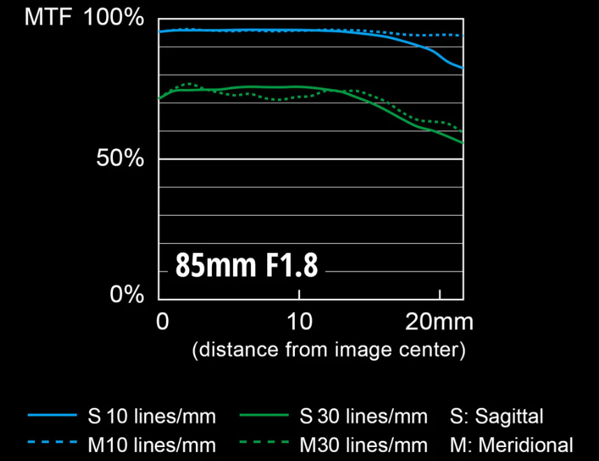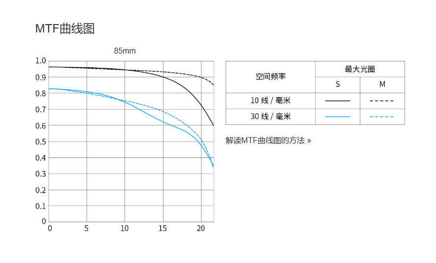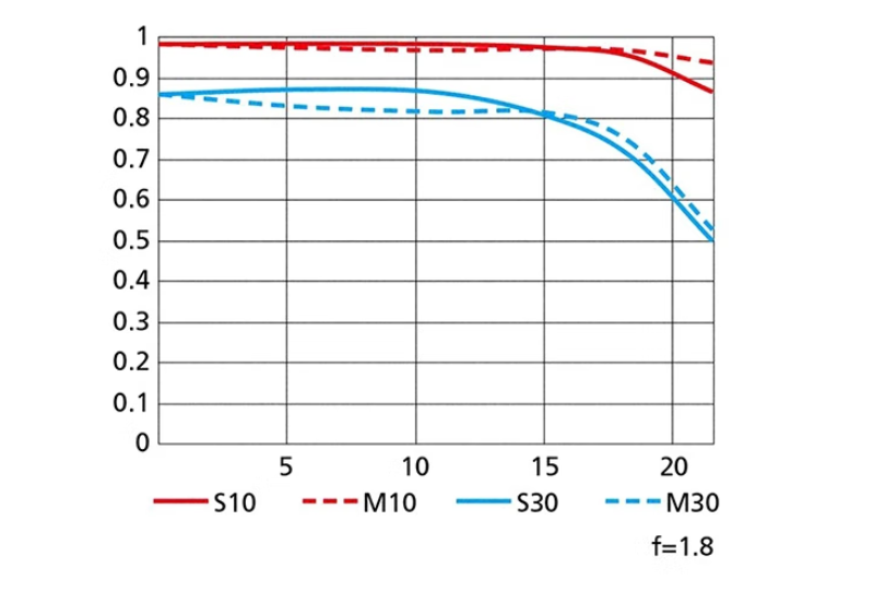 从MTF曲线看,30线表现一般,还不如很多国产1000多的85 F1.8镜头表现。