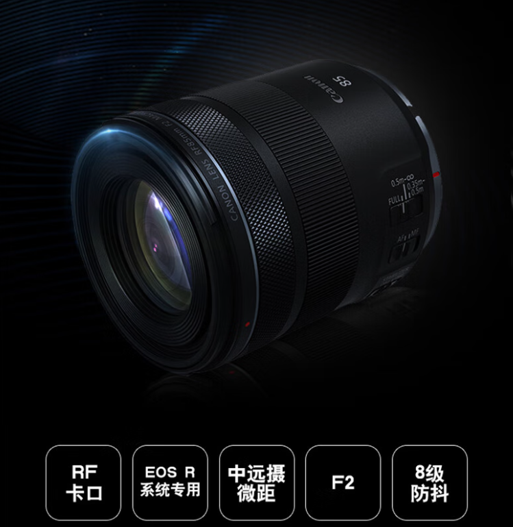 佳能就没有RF卡口的85 1.8了,这款F2也不错,还有IS防抖,比较难得。具有0.35米最近对焦距离,0.5倍放大倍率。镜组为11组12片,9片光圈叶片,STM步进马达,5级防抖,滤镜67mm,重量500克。